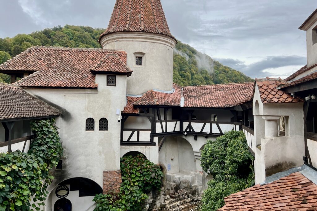 Eigentlich handelt es sich aber um eine ganz normale, wenn auch ungewöhnlich verwinkelte Burg mit kleinen und kleinsten Zimmerchen und vielen engen Treppen, deren eine zwar lange geheim geblieben war, heute aber durch einen Wegweiser gekennzeichnet ist. Ein wenig gruselig wird es erst ganz oben, wo auf einer Leinwand Ausschnitte aus diversen Spielfilmen gezeigt werden, angefangen bei F.W. Murnaus „Nosferatu“ von 1922 bis hin zum Zeichentrick-Dracula aus „Hotel Transsilvanien“. Die Ängste, die man hier oben auszustehen hat, resultieren aber vor allem aus dem Gedränge, das von den vielen nachrückenden Besuchern ausgeht, denn es gilt dieselbe enge Wendeltreppe wieder hinabzusteigen, über die man gekommen ist. Auf der kleinen Loggia wird es dann sogar richtig heimelig, blickt man von hier doch regengeschützt hinab in den Burghof und hinaus auf die umgebende Landschaft. Der Regen hat inzwischen aber ohnehin aufgehört. Vorbei am kleinen Kino, das Filmdokumente aus der Kaiserzeit zeigt, gelangen wir schließlich über weitere enge Treppen hinab in den Burghof und von dort wieder hinaus ins Freie. Unten gibt es dann noch einen königlichen Park mit kleinem See und schönem Blick auf die Burg – und eine Geisterbahn!