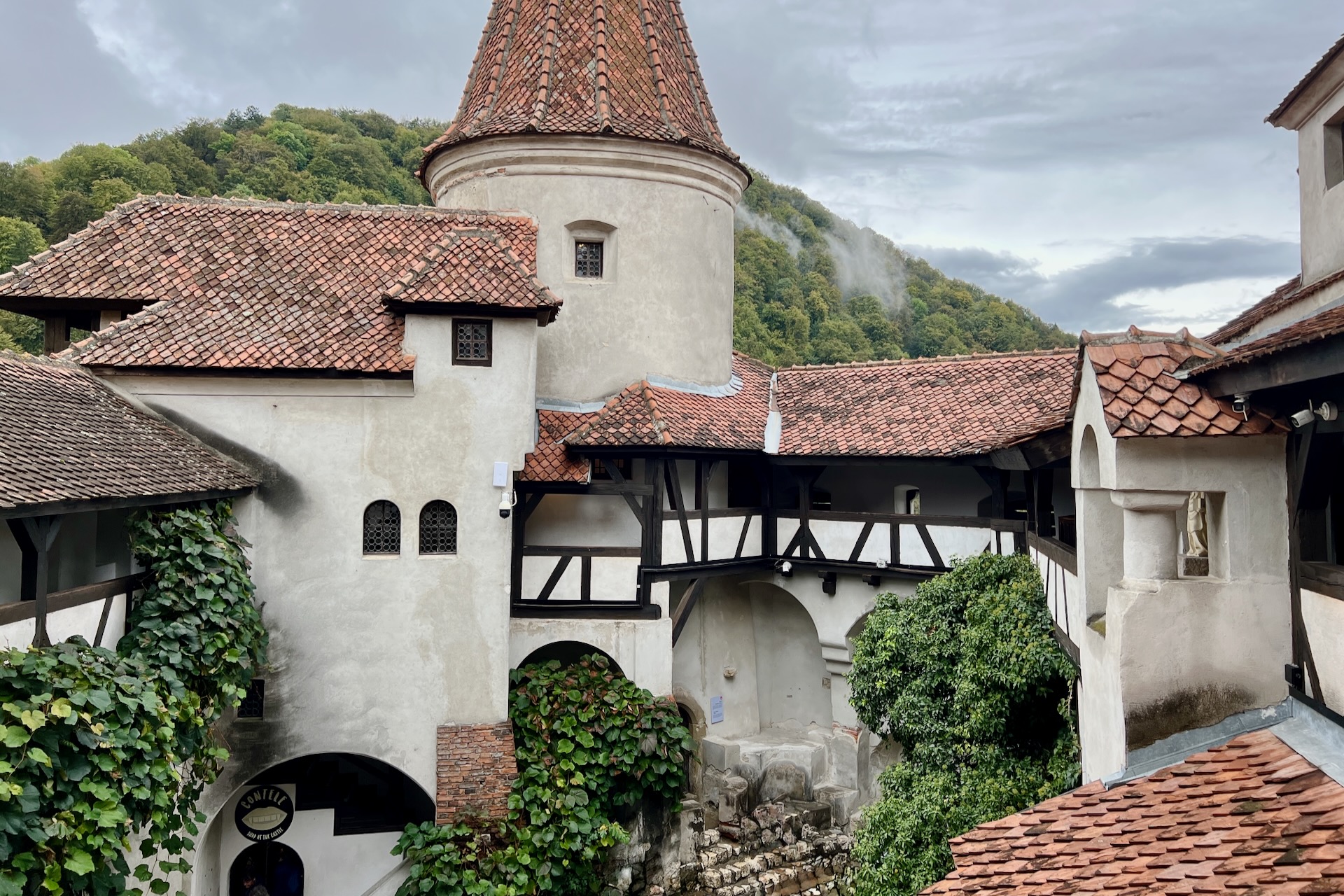 Ausgerüstet mit Kreuz, Knoblauch, Holzpfahl, Gummistiefeln und regenfester Kleidung brechen wir nach dem Frühstück zur 30 Kilometer von Kronstadt entfernten Törzburg auf, die als die Burg des Grafen Dracula bekannt ist. Die ersten drei führen wir nur in Gedanken mit uns, das vierte hätten wir gern, und um das letzte sind wir froh, denn vom Busparkplatz bis hinauf zum Eingang der Burg sind es einige hundert Meter Fußweg. Die tief hängenden Wolken und die um die Berge ziehenden Nebelfetzen stören aber nicht, im Gegenteil: sie unterstreichen sogar noch das düstere Gefühl, das diese Namen einst in uns auslösten: Transsylvanien als eine Gegend, in der man sich nachts lieber nicht aus dem Haus wagt, und der nach Blut dürstende Untote, dessen Burg wir nun zu betreten im Begriff sind.
