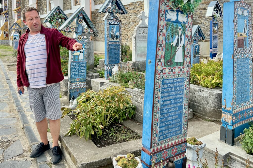 Unser erstes Übernachtungsziel befindet sich im benachbarten Baia Mare, zu deutsch Frauenbach. Wir fahren allerdings nicht direkt dorthin, sondern nehmen vorher noch einen Umweg über den Ort Sapanta, wo es einen bemerkenswerten Friedhof gibt. Beides liegt so nahe an der ukrainischen Grenze, dass wir unsere Smartphones lieber in den Flugmodus versetzen, um nicht ungewollt in deren Handynetz zu geraten. Der Friedhof zeichnet sich durch blau-bunte Grabkreuze aus, auf denen unter einem farbig bemalten Reliefbild recht locker und humorvoll das Leben der Verstorbenen festgehalten ist: wir sehen diverse Nutztiere, Traktoren, Nähmaschinen und sogar einen Militärlaster. Natürlich wollen auch alle das Grab der bösen Schwiegermutter sehen.