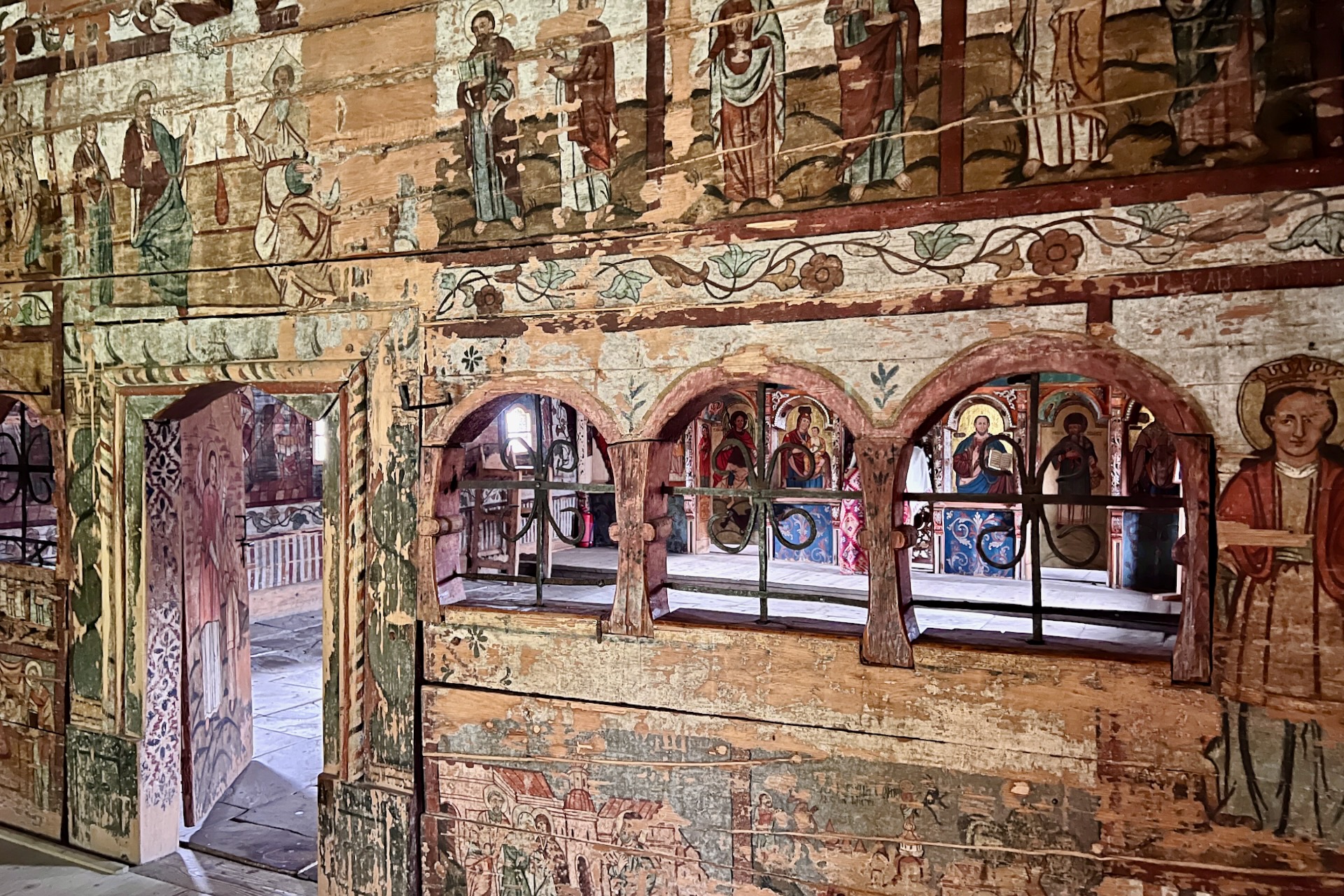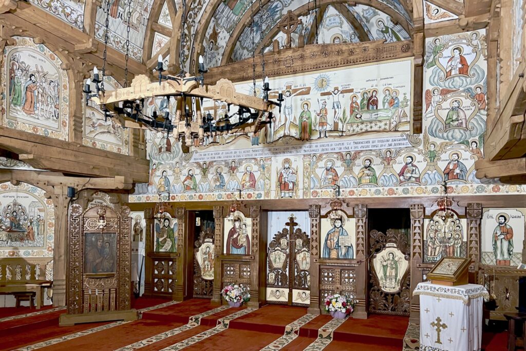 Entlang der Straße nach Bogdan Voda sehen wir etliche dieser Kirchen, einige alt und aus Holz, andere frisch und modern. Eine dieser uralten Holzkirchen wollen wir besichtigen. Da sie nicht mehr aktiv genutzt wird, gibt es auch kein Licht im Inneren, so daß die ortskundige Führung eher einer Höhlenexpedition gleicht. Und was da nicht alles vom Schein der Taschenlampe aus dem Dunkel gerissen wird! Ein Teufel ist da zu sehen oder ein Mann, dem als Strafe das Gehör zerstört wird.