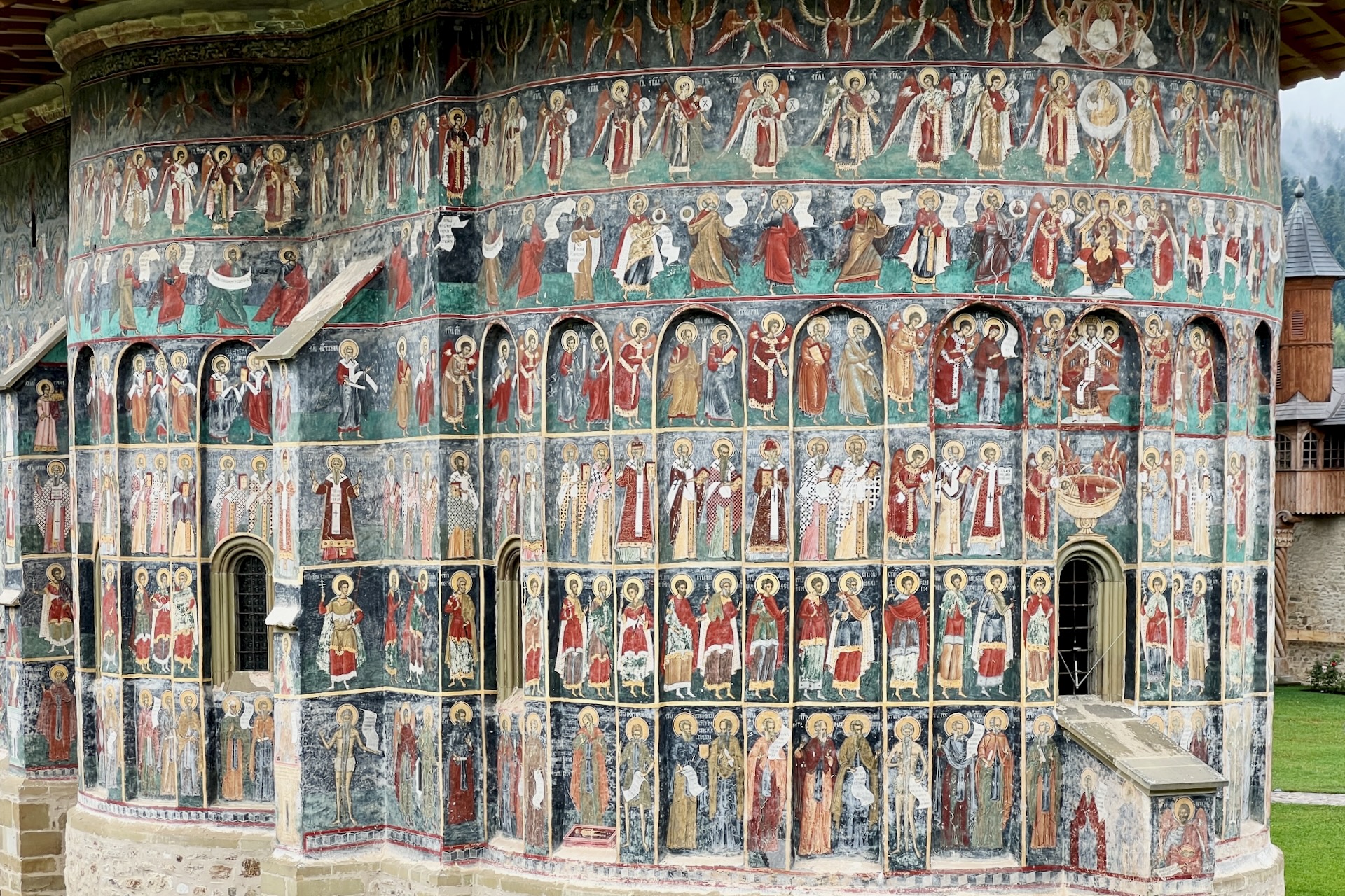 Im Kloster von Moldovitza werden wir von Schwester Tatjana empfangen, einer resoluten älteren Dame mit Gehstock und Brille, die uns in feldwebelartigem Tonfall und erfüllt von Sendungsbewußtsein die Ikonografie der alten Fresken an der Außenfassade der Klosterkirche erläutert, während sie den grünen Lichtpunkt des Laserpointers über die einzelnen Motive der christlichen Heilslehre wandern läßt. Wir erleben die Gottesmutter Eva als Höhle, erfahren den Unterschied zwischen Heiligen und Philosophen und noch vieles mehr. Leider ist das markanteste Motiv, die 33-stufige Himmelsleiter mit den Engeln, zur Zeit von einem Baugerüst verunstaltet. Der Erhalt und die Reinigung der Fresken sind aber enorm wichtig, schließlich handelt es sich um UNESCO-Weltkulturerbe. Das Prorramm setzt sich im Inneren der Kirche fort, wo es für jeden Tag des Jahres ein eigenes Bildmotiv gibt.