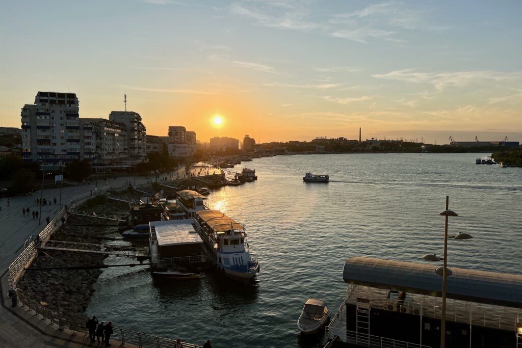 Dass die Donau auf ihrem Weg ins Delta ein gutes Stück weit nach Norden fließt, liegt am Herzynischen Gebirge, das geologisch älter ist als die Alpen und nur noch wenige hundert Meter hoch. Schon bald erreichen wir aber das Städtchen Tulcea mit dem Delta Hotel, von dem aus wir morgen per Schiff ins Donaudelta starten werden.