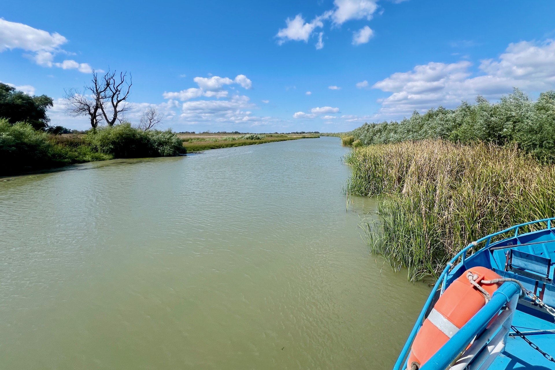 Der gestrige Luftalarm stand im Zusammenhang mit einer russischen Drohne, die sich auf rumänisches Territorium verirrt hatte. Zum Glück hat der Vorfall keinen Einfluß auf unser heutiges Programm, das eine Schiffstour bis weit ins Delta hinein vorsieht. Gespannt erwarten wir also die Sichtung diverser Wasservögel entlang der Schiffsroute. Da, ein Reiher! Reglos späht der Vogel am Ufer nach Beute. Und sind das, was dort in großer Entfernung über den Himmel zieht, nicht Pelikane? Es sind Pelikane. Gesichtet werden zudem einige Ibisse, Kormorane, Raubvögel und Möven, die alle eines gemeinsam haben: sie befinden sich weit weit weg am Himmel. Die Tiersichtungen in Ufernähe hingegen beschränken sich auf etwas Rotfelliges, das in der Kürze der Zeit nicht eindeutig identifiziert werden kann, sowie einen sich direkt neben dem Bootsrumpf abstrampelnden Frosch.