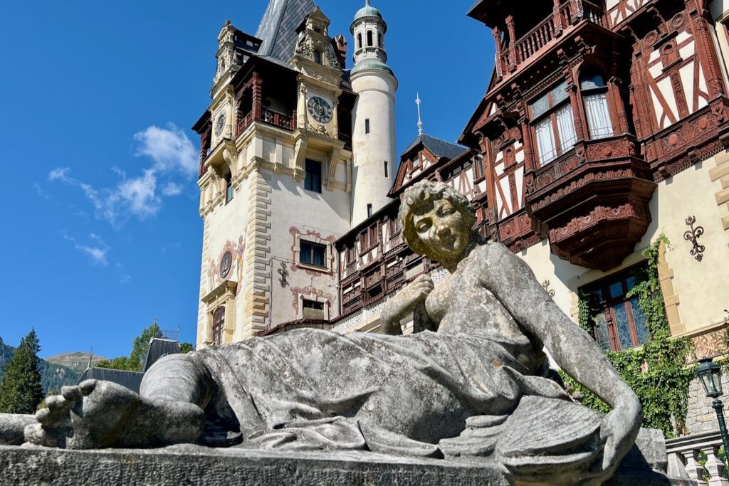 Die Hauptstadt Bukarest liegt inmitten der Walachei, also dem südlichsten Landesteil Rumäniens, wo die Landschaft vollkommen eben ist. Fährt man von hier nach Norden, erreicht man aber schon bald die Südkarpaten, eine Region mit zweienhalbtausend Meter hohen Bergen, von denen einige mit Bergbahnen erschlossen sind. Um die Jahrhundertwende herum hat sich König König Carol I. von Rumänien in dieser malerischen Landschaft ein Schloss errichten lassen, das unseren bayerischen Märchenschlössern in nichts nachsteht. Leider hat es ausgerechnet heute geschlossen, sa dass wir es nur von außen besichtigen können. Zehn Minuten sind dafür veranschlagt, plus weitere 20 Minuten für den Fußweg vom Parkplatz und wieder dorthin zurück. Natürlich reicht die Zeit trotz herbstbedingt abgedrehter Springbrunnen und abgeblühter Blumenbeete bei weitem nicht. Wir tun aber unser bestes.