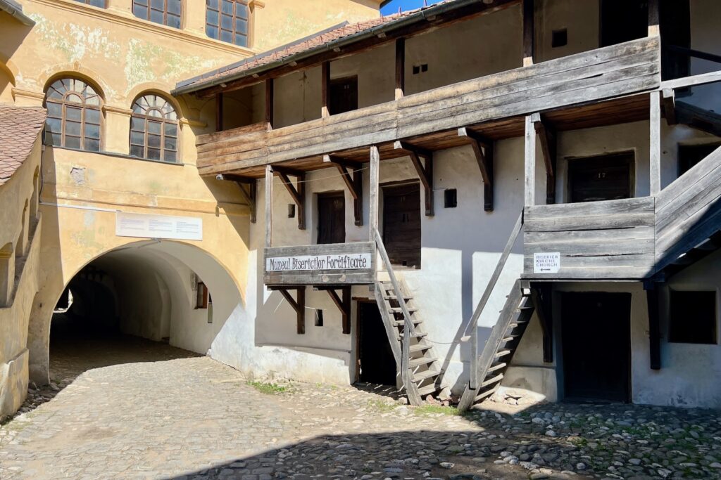 Brașov und das Hotel mit den vielen Bildern liegt hinter uns. Durch eine Landschaft, die wegen ihres Hopfenanbaus stellenweise der Hallertau gleicht, erreichen wir schon bald Schäßburg, das „Rothenburg des Ostens“. Inmitten der malerischen Häuser im siebensächstischen Stil entdecken wir eine Büste des Raketen-Pioniers Hermann Oberth, der ein paar Jahre seines Lebens hier zugebracht hat. Ein schmales gepflastertes Sträßchen führt hinauf zum mächtigen Uhrturm mit einen vier Eckzinnen, die für die Gerichtsbarkeit des Ortes stehen. Durch den Torbogen und über einen malerischen Platz gelangen wir zur berühmten überdachten Schülertreppe mit ihren 186 Holzstufen. Als Lohn der Mühe winken oben die deutsche Schule, in der sämtlicher Unterricht auf deutsch gehalten wird, dessen Schüler aber vor der Tür rumänisch sprechen. Gleich daneben befindet sich die Bergkirche von 1514 mit freigelegten Fresken, einer bemerkenswerten Orgel und einem Sakramentshäuschen. Interessant ist auch der Friedhof, zeigt er doch ausschließlich deutsche Namen.